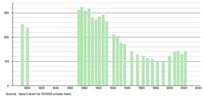 L'évolution du nombre d'habitants est connue à travers les recensements de la population effectués dans la commune depuis 1793. Pour les communes de moins de 10 000 habitants, une enquête de recensement portant sur toute la population est réalisée tous les cinq ans, les populations légales des années intermédiaires étant quant à elles estimées par interpolation ou extrapolation[30]. Pour la commune, le premier recensement exhaustif entrant dans le cadre du nouveau dispositif a été réalisé en 2006[31].