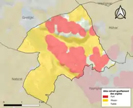 Le retrait-gonflement des sols argileux est susceptible d'engendrer des dommages importants aux bâtiments en cas d’alternance de périodes de sécheresse et de pluie. 91,6 % de la superficie communale est en aléa moyen ou fort (67,7 % au niveau départemental et 48,5 % au niveau national). Sur les 107 bâtiments dénombrés sur la commune en 2019, 105 sont en aléa moyen ou fort, soit 98 %, à comparer aux 72 % au niveau départemental et 54 % au niveau national. Une cartographie de l'exposition du territoire national au retrait gonflement des sols argileux est disponible sur le site du BRGM[23],[Carte 2].