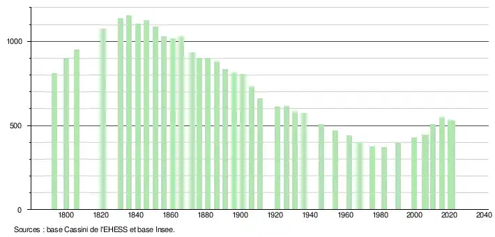 L'évolution du nombre d'habitants est connue à travers les recensements de la population effectués dans la commune depuis 1793. Pour les communes de moins de 10 000 habitants, une enquête de recensement portant sur toute la population est réalisée tous les cinq ans, les populations légales des années intermédiaires étant quant à elles estimées par interpolation ou extrapolation[26]. Pour la commune, le premier recensement exhaustif entrant dans le cadre du nouveau dispositif a été réalisé en 2005[27].