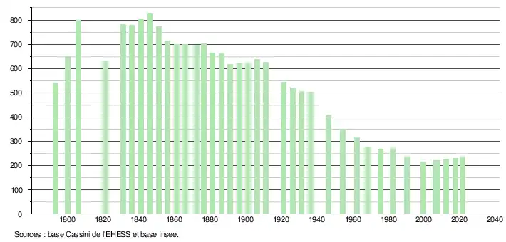 L'évolution du nombre d'habitants est connue à travers les recensements de la population effectués dans la commune depuis 1793. Pour les communes de moins de 10 000 habitants, une enquête de recensement portant sur toute la population est réalisée tous les cinq ans, les populations légales des années intermédiaires étant quant à elles estimées par interpolation ou extrapolation[15]. Pour la commune, le premier recensement exhaustif entrant dans le cadre du nouveau dispositif a été réalisé en 2007[16].