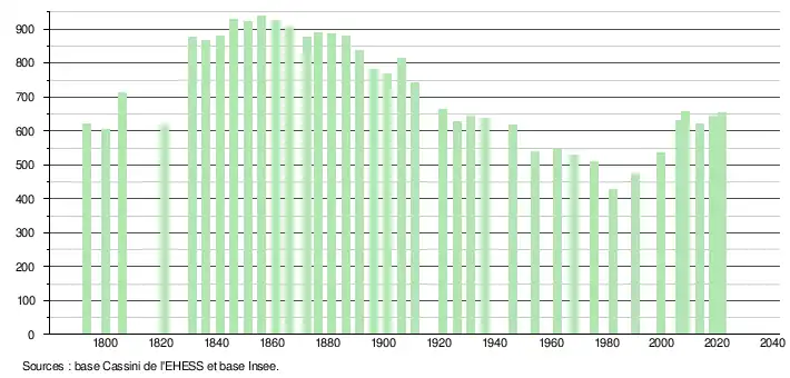 L'évolution du nombre d'habitants est connue à travers les recensements de la population effectués dans la commune depuis 1793. Pour les communes de moins de 10 000 habitants, une enquête de recensement portant sur toute la population est réalisée tous les cinq ans, les populations légales des années intermédiaires étant quant à elles estimées par interpolation ou extrapolation[17]. Pour la commune, le premier recensement exhaustif entrant dans le cadre du nouveau dispositif a été réalisé en 2008[18].