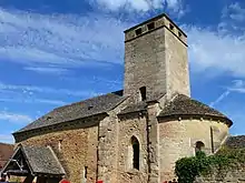 - La commune possède une église romane du XIIe siècle (classée monument historique en 1927)[20]. L'église comporte des éléments (murs inférieurs de la nef) du Xe siècle, ce qui en fait une des plus anciennes du département[21]. Elle a dû servir de refuge autrefois : fenêtres élevées et étroites, clocher assez haut dont les ouvertures servaient au guet et à la défense. Du haut de ce clocher qui abrite deux cloches, fondues respectivement en 1817 et 1860[22], la vue est particulièrement étendue sur les vallées de la Guye et de la Grosne, sur les monts du Charolais et du Mâconnais, et bien au-delà quand le temps est favorable.
