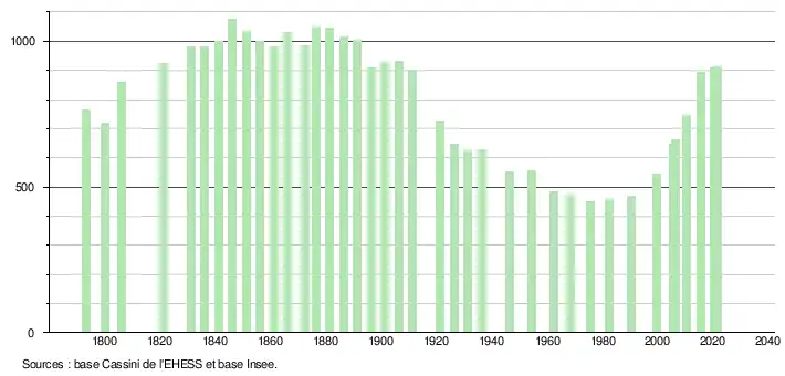 L'évolution du nombre d'habitants est connue à travers les recensements de la population effectués dans la commune depuis 1793. Pour les communes de moins de 10 000 habitants, une enquête de recensement portant sur toute la population est réalisée tous les cinq ans, les populations légales des années intermédiaires étant quant à elles estimées par interpolation ou extrapolation[14]. Pour la commune, le premier recensement exhaustif entrant dans le cadre du nouveau dispositif a été réalisé en 2005[15].