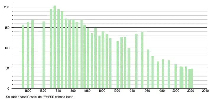 L'évolution du nombre d'habitants est connue à travers les recensements de la population effectués dans la commune depuis 1793. Pour les communes de moins de 10 000 habitants, une enquête de recensement portant sur toute la population est réalisée tous les cinq ans, les populations légales des années intermédiaires étant quant à elles estimées par interpolation ou extrapolation[20]. Pour la commune, le premier recensement exhaustif entrant dans le cadre du nouveau dispositif a été réalisé en 2008[21].