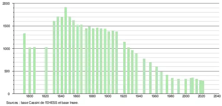 L'évolution du nombre d'habitants est connue à travers les recensements de la population effectués dans la commune depuis 1793. Pour les communes de moins de 10 000 habitants, une enquête de recensement portant sur toute la population est réalisée tous les cinq ans, les populations légales des années intermédiaires étant quant à elles estimées par interpolation ou extrapolation[30]. Pour la commune, le premier recensement exhaustif entrant dans le cadre du nouveau dispositif a été réalisé en 2008[31].