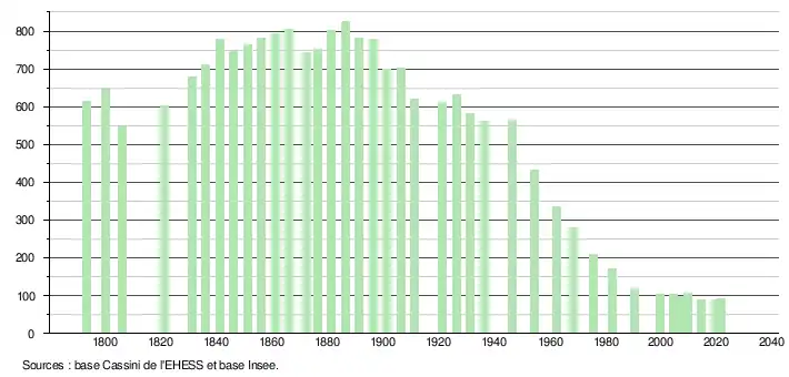 L'évolution du nombre d'habitants est connue à travers les recensements de la population effectués dans la commune depuis 1793. Pour les communes de moins de 10 000 habitants, une enquête de recensement portant sur toute la population est réalisée tous les cinq ans, les populations légales des années intermédiaires étant quant à elles estimées par interpolation ou extrapolation[18]. Pour la commune, le premier recensement exhaustif entrant dans le cadre du nouveau dispositif a été réalisé en 2004[19].