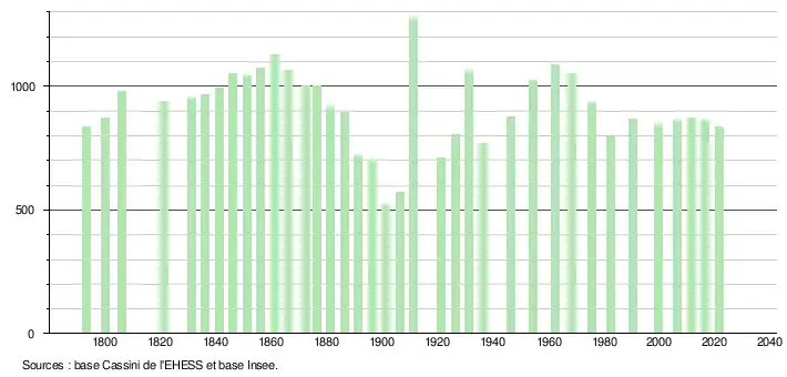 L'évolution du nombre d'habitants est connue à travers les recensements de la population effectués dans la commune depuis 1793. Pour les communes de moins de 10 000 habitants, une enquête de recensement portant sur toute la population est réalisée tous les cinq ans, les populations légales des années intermédiaires étant quant à elles estimées par interpolation ou extrapolation[21]. Pour la commune, le premier recensement exhaustif entrant dans le cadre du nouveau dispositif a été réalisé en 2006[22].