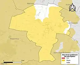 Les mouvements de terrains susceptibles de se produire sur la commune sont des tassements différentiels[16]. Le retrait-gonflement des sols argileux est susceptible d'engendrer des dommages importants aux bâtiments en cas d’alternance de périodes de sécheresse et de pluie[17]. 86,5 % de la superficie communale est en aléa moyen ou fort (79,5 % au niveau départemental et 48,5 % au niveau national)[Carte 2]. Depuis le , en application de la loi ÉLAN, différentes contraintes s'imposent aux vendeurs, maîtres d'ouvrages ou constructeurs de biens situés dans une zone classée en aléa moyen ou fort[Note 2],[18].