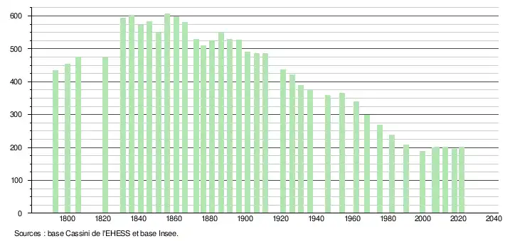 L'évolution du nombre d'habitants est connue à travers les recensements de la population effectués dans la commune depuis 1793. Pour les communes de moins de 10 000 habitants, une enquête de recensement portant sur toute la population est réalisée tous les cinq ans, les populations légales des années intermédiaires étant quant à elles estimées par interpolation ou extrapolation[23]. Pour la commune, le premier recensement exhaustif entrant dans le cadre du nouveau dispositif a été réalisé en 2007[24].