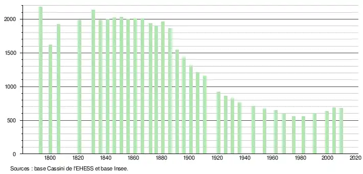 - Dans le tableau des recensements et le graphique, par convention dans Wikipédia, le principe a été retenu, pour les populations légales postérieures à 1999 de n’afficher dans le tableau des recensements et le graphique que les populations correspondant à l'année 2006, première population légale publiée calculée conformément aux concepts définis dans le décret no 2003-485 du 5 juin 2003, et les années correspondant à une enquête exhaustive de recensement pour les communes de moins de 10 000 habitants, ainsi que la dernière population légale publiée par l’Insee.