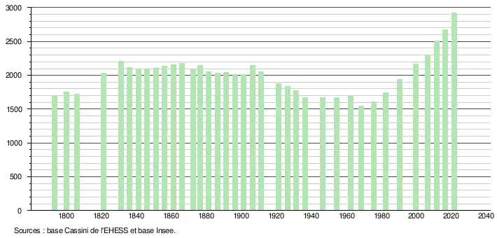 L'évolution du nombre d'habitants est connue à travers les recensements de la population effectués dans la commune depuis 1793. Pour les communes de moins de 10 000 habitants, une enquête de recensement portant sur toute la population est réalisée tous les cinq ans, les populations légales des années intermédiaires étant quant à elles estimées par interpolation ou extrapolation[26]. Pour la commune, le premier recensement exhaustif entrant dans le cadre du nouveau dispositif a été réalisé en 2006[27].