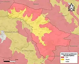 Le retrait-gonflement des sols argileux est susceptible d'engendrer des dommages importants aux bâtiments en cas d’alternance de périodes de sécheresse et de pluie. La totalité de la commune est en aléa moyen ou fort (67,4 % au niveau départemental et 48,5 % au niveau national). Sur les 158 bâtiments dénombrés sur la commune en 2019, 158 sont en aléa moyen ou fort, soit 100 %, à comparer aux 81 % au niveau départemental et 54 % au niveau national. Une cartographie de l'exposition du territoire national au retrait gonflement des sols argileux est disponible sur le site du BRGM[19],[Carte 3].