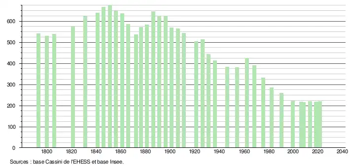 L'évolution du nombre d'habitants est connue à travers les recensements de la population effectués dans la commune depuis 1793. Pour les communes de moins de 10 000 habitants, une enquête de recensement portant sur toute la population est réalisée tous les cinq ans, les populations légales des années intermédiaires étant quant à elles estimées par interpolation ou extrapolation[28]. Pour la commune, le premier recensement exhaustif entrant dans le cadre du nouveau dispositif a été réalisé en 2008[29].