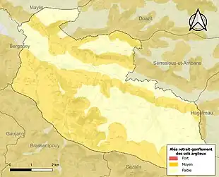 Le retrait-gonflement des sols argileux est susceptible d'engendrer des dommages importants aux bâtiments en cas d’alternance de périodes de sécheresse et de pluie. 55,1 % de la superficie communale est en aléa moyen ou fort (19,2 % au niveau départemental et 48,5 % au niveau national). Sur les 312 bâtiments dénombrés sur la commune en 2019, 140 sont en aléa moyen ou fort, soit 45 %, à comparer aux 17 % au niveau départemental et 54 % au niveau national. Une cartographie de l'exposition du territoire national au retrait gonflement des sols argileux est disponible sur le site du BRGM[19],[Carte 2].