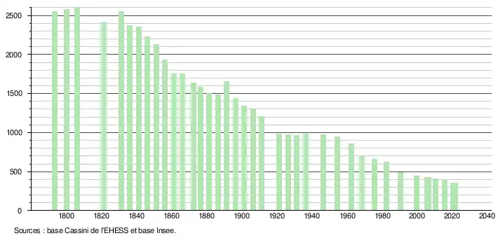 L'évolution du nombre d'habitants est connue à travers les recensements de la population effectués dans la commune depuis 1793. Pour les communes de moins de 10 000 habitants, une enquête de recensement portant sur toute la population est réalisée tous les cinq ans, les populations légales des années intermédiaires étant quant à elles estimées par interpolation ou extrapolation[24]. Pour la commune, le premier recensement exhaustif entrant dans le cadre du nouveau dispositif a été réalisé en 2005[25].