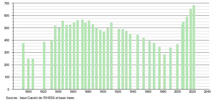 L'évolution du nombre d'habitants est connue à travers les recensements de la population effectués dans la commune depuis 1793. Pour les communes de moins de 10 000 habitants, une enquête de recensement portant sur toute la population est réalisée tous les cinq ans, les populations légales des années intermédiaires étant quant à elles estimées par interpolation ou extrapolation[16]. Pour la commune, le premier recensement exhaustif entrant dans le cadre du nouveau dispositif a été réalisé en 2007[17].