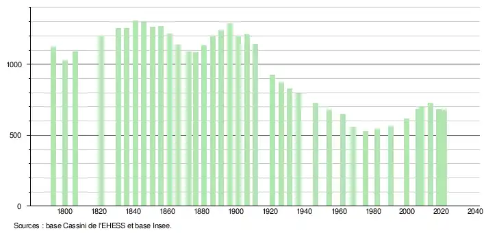 L'évolution du nombre d'habitants est connue à travers les recensements de la population effectués dans la commune depuis 1793. Pour les communes de moins de 10 000 habitants, une enquête de recensement portant sur toute la population est réalisée tous les cinq ans, les populations légales des années intermédiaires étant quant à elles estimées par interpolation ou extrapolation[20]. Pour la commune, le premier recensement exhaustif entrant dans le cadre du nouveau dispositif a été réalisé en 2008[21].