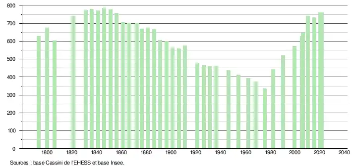 L'évolution du nombre d'habitants est connue à travers les recensements de la population effectués dans la commune depuis 1793. Pour les communes de moins de 10 000 habitants, une enquête de recensement portant sur toute la population est réalisée tous les cinq ans, les populations légales des années intermédiaires étant quant à elles estimées par interpolation ou extrapolation[16]. Pour la commune, le premier recensement exhaustif entrant dans le cadre du nouveau dispositif a été réalisé en 2005[17].