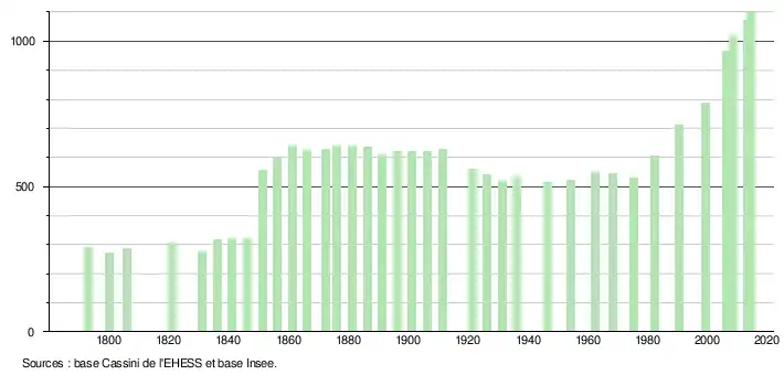 L'évolution du nombre d'habitants est connue à travers les recensements de la population effectués dans la commune depuis 1793. Pour les communes de moins de 10 000 habitants, une enquête de recensement portant sur toute la population est réalisée tous les cinq ans, les populations légales des années intermédiaires étant quant à elles estimées par interpolation ou extrapolation[7]. Pour la commune, le premier recensement exhaustif entrant dans le cadre du nouveau dispositif a été réalisé en 2008[8].