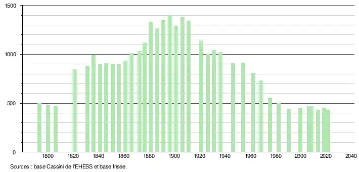 L'évolution du nombre d'habitants est connue à travers les recensements de la population effectués dans la commune depuis 1793. Pour les communes de moins de 10 000 habitants, une enquête de recensement portant sur toute la population est réalisée tous les cinq ans, les populations légales des années intermédiaires étant quant à elles estimées par interpolation ou extrapolation[21]. Pour la commune, le premier recensement exhaustif entrant dans le cadre du nouveau dispositif a été réalisé en 2008[22].