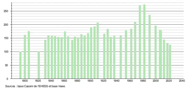 L'évolution du nombre d'habitants est connue à travers les recensements de la population effectués dans la commune depuis 1793. Pour les communes de moins de 10 000 habitants, une enquête de recensement portant sur toute la population est réalisée tous les cinq ans, les populations légales des années intermédiaires étant quant à elles estimées par interpolation ou extrapolation[23]. Pour la commune, le premier recensement exhaustif entrant dans le cadre du nouveau dispositif a été réalisé en 2007[24].