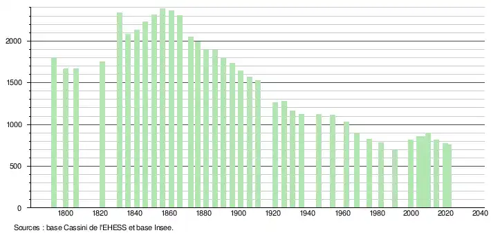 L'évolution du nombre d'habitants est connue à travers les recensements de la population effectués dans la commune depuis 1793. Pour les communes de moins de 10 000 habitants, une enquête de recensement portant sur toute la population est réalisée tous les cinq ans, les populations légales des années intermédiaires étant quant à elles estimées par interpolation ou extrapolation[19]. Pour la commune, le premier recensement exhaustif entrant dans le cadre du nouveau dispositif a été réalisé en 2004[20].