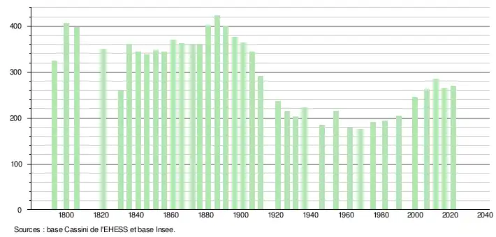 L'évolution du nombre d'habitants est connue à travers les recensements de la population effectués dans la commune depuis 1793. Pour les communes de moins de 10 000 habitants, une enquête de recensement portant sur toute la population est réalisée tous les cinq ans, les populations légales des années intermédiaires étant quant à elles estimées par interpolation ou extrapolation[16]. Pour la commune, le premier recensement exhaustif entrant dans le cadre du nouveau dispositif a été réalisé en 2006[17].