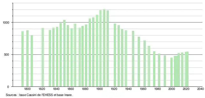 L'évolution du nombre d'habitants est connue à travers les recensements de la population effectués dans la commune depuis 1793. Pour les communes de moins de 10 000 habitants, une enquête de recensement portant sur toute la population est réalisée tous les cinq ans, les populations légales des années intermédiaires étant quant à elles estimées par interpolation ou extrapolation[35]. Pour la commune, le premier recensement exhaustif entrant dans le cadre du nouveau dispositif a été réalisé en 2004[36].