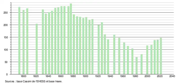 L'évolution du nombre d'habitants est connue à travers les recensements de la population effectués dans la commune depuis 1793. Pour les communes de moins de 10 000 habitants, une enquête de recensement portant sur toute la population est réalisée tous les cinq ans, les populations légales des années intermédiaires étant quant à elles estimées par interpolation ou extrapolation[22]. Pour la commune, le premier recensement exhaustif entrant dans le cadre du nouveau dispositif a été réalisé en 2006[23].