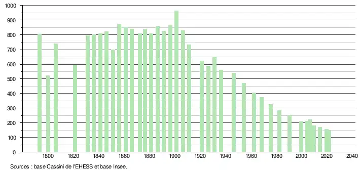 L'évolution du nombre d'habitants est connue à travers les recensements de la population effectués dans la commune depuis 1793. Pour les communes de moins de 10 000 habitants, une enquête de recensement portant sur toute la population est réalisée tous les cinq ans, les populations légales des années intermédiaires étant quant à elles estimées par interpolation ou extrapolation[23]. Pour la commune, le premier recensement exhaustif entrant dans le cadre du nouveau dispositif a été réalisé en 2004[24].