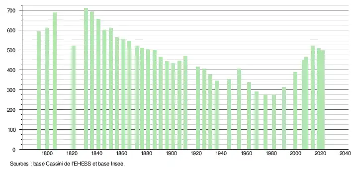 | L'évolution du nombre d'habitants est connue à travers les recensements de la population effectués dans la commune depuis 1793. Pour les communes de moins de 10 000 habitants, une enquête de recensement portant sur toute la population est réalisée tous les cinq ans, les populations légales des années intermédiaires étant quant à elles estimées par interpolation ou extrapolation[22]. Pour la commune, le premier recensement exhaustif entrant dans le cadre du nouveau dispositif a été réalisé en 2008[23]. En 2021, la commune comptait 498 habitants[Note 5], en diminution de 3,68 % par rapport à 2015 (Aude : +2,47 %, France hors Mayotte : +1,84 %). |