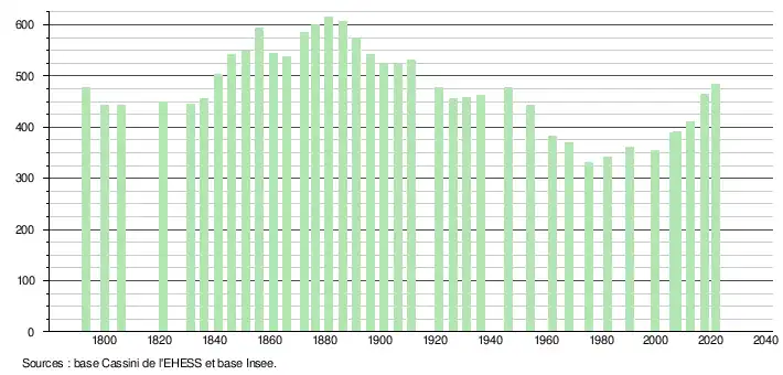 L'évolution du nombre d'habitants est connue à travers les recensements de la population effectués dans la commune depuis 1793. Pour les communes de moins de 10 000 habitants, une enquête de recensement portant sur toute la population est réalisée tous les cinq ans, les populations légales des années intermédiaires étant quant à elles estimées par interpolation ou extrapolation[17]. Pour la commune, le premier recensement exhaustif entrant dans le cadre du nouveau dispositif a été réalisé en 2007[18].