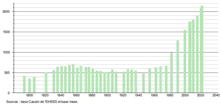L'évolution du nombre d'habitants est connue à travers les recensements de la population effectués dans la commune depuis 1793. Pour les communes de moins de 10 000 habitants, une enquête de recensement portant sur toute la population est réalisée tous les cinq ans, les populations légales des années intermédiaires étant quant à elles estimées par interpolation ou extrapolation[21]. Pour la commune, le premier recensement exhaustif entrant dans le cadre du nouveau dispositif a été réalisé en 2005[22].