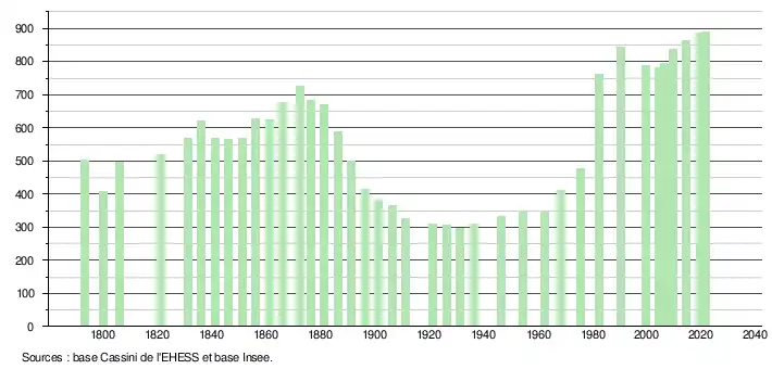 L'évolution du nombre d'habitants est connue à travers les recensements de la population effectués dans la commune depuis 1793. Pour les communes de moins de 10 000 habitants, une enquête de recensement portant sur toute la population est réalisée tous les cinq ans, les populations légales des années intermédiaires étant quant à elles estimées par interpolation ou extrapolation[19]. Pour la commune, le premier recensement exhaustif entrant dans le cadre du nouveau dispositif a été réalisé en 2004[20].