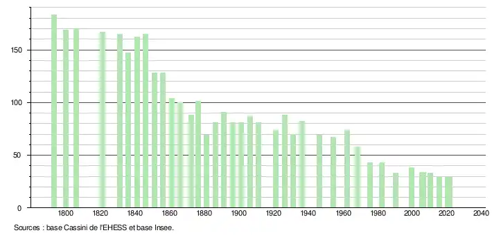L'évolution du nombre d'habitants est connue à travers les recensements de la population effectués dans la commune depuis 1793. Pour les communes de moins de 10 000 habitants, une enquête de recensement portant sur toute la population est réalisée tous les cinq ans, les populations légales des années intermédiaires étant quant à elles estimées par interpolation ou extrapolation[14]. Pour la commune, le premier recensement exhaustif entrant dans le cadre du nouveau dispositif a été réalisé en 2005[15].