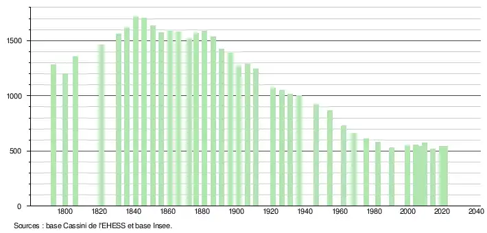 L'évolution du nombre d'habitants est connue à travers les recensements de la population effectués dans la commune depuis 1793. Pour les communes de moins de 10 000 habitants, une enquête de recensement portant sur toute la population est réalisée tous les cinq ans, les populations légales des années intermédiaires étant quant à elles estimées par interpolation ou extrapolation[27]. Pour la commune, le premier recensement exhaustif entrant dans le cadre du nouveau dispositif a été réalisé en 2004[28].
