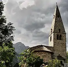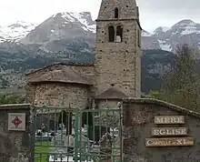 - La chapelle des Gicons, dite « Mère Église », est classée monument historique depuis 1927. Cette petite église, dont la date de construction est inconnue (XIe ou XIIe siècle), et dont le surnom est d'origine inconnue (mère pour maire, principale ?), est de style roman, comportant une nef à trois travées en voûtes de plein cintre et une abside semi-circulaire, le tout flanqué d'une chapelle latérale surmontée du clocher et prolongée par une absidiole. Le bâtiment, plusieurs fois modifié, a été longtemps laissé à l'abandon. Il est actuellement en cours de restauration à l'instigation d'une association locale[10], et avec le soutien de la commune.