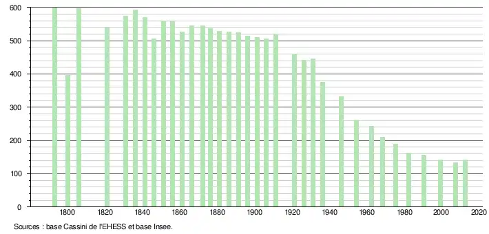 - Par convention dans Wikipédia, le principe a été retenu de n’afficher dans le tableau des recensements et le graphique, pour les populations légales postérieures à 1999, que les populations correspondant à une enquête exhaustive de recensement pour les communes de moins de 10 000 habitants, et que les populations des années 2006, 2011, 2016, etc. pour les communes de plus de 10 000 habitants, ainsi que la dernière population légale publiée par l’Insee pour l'ensemble des communes.