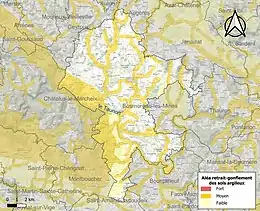 Le retrait-gonflement des sols argileux est susceptible d'engendrer des dommages importants aux bâtiments en cas d’alternance de périodes de sécheresse et de pluie. 38,7 % de la superficie communale est en aléa moyen ou fort (33,6 % au niveau départemental et 48,5 % au niveau national). Sur les 888 bâtiments dénombrés sur la commune en 2019, 158 sont en aléa moyen ou fort, soit 18 %, à comparer aux 25 % au niveau départemental et 54 % au niveau national. Une cartographie de l'exposition du territoire national au retrait gonflement des sols argileux est disponible sur le site du BRGM[15],[16].