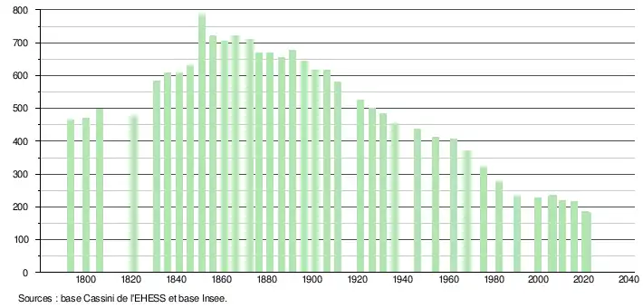 L'évolution du nombre d'habitants est connue à travers les recensements de la population effectués dans la commune depuis 1793. Pour les communes de moins de 10 000 habitants, une enquête de recensement portant sur toute la population est réalisée tous les cinq ans, les populations légales des années intermédiaires étant quant à elles estimées par interpolation ou extrapolation[20]. Pour la commune, le premier recensement exhaustif entrant dans le cadre du nouveau dispositif a été réalisé en 2005[21].