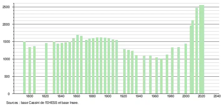 L'évolution du nombre d'habitants est connue à travers les recensements de la population effectués dans la commune depuis 1793. Pour les communes de moins de 10 000 habitants, une enquête de recensement portant sur toute la population est réalisée tous les cinq ans, les populations légales des années intermédiaires étant quant à elles estimées par interpolation ou extrapolation[31]. Pour la commune, le premier recensement exhaustif entrant dans le cadre du nouveau dispositif a été réalisé en 2008[32].