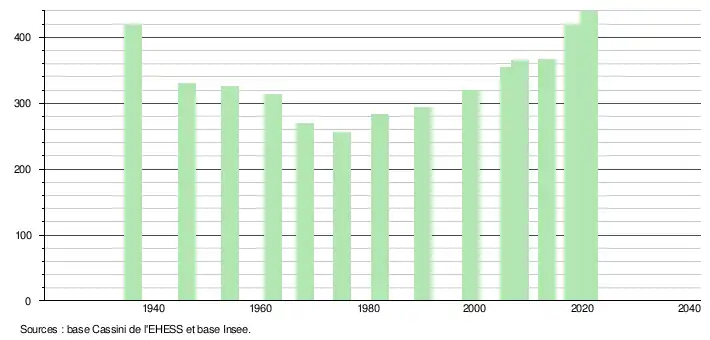 L'évolution du nombre d'habitants est connue à travers les recensements de la population effectués dans la commune depuis 1936. Pour les communes de moins de 10 000 habitants, une enquête de recensement portant sur toute la population est réalisée tous les cinq ans, les populations légales des années intermédiaires étant quant à elles estimées par interpolation ou extrapolation[17]. Pour la commune, le premier recensement exhaustif entrant dans le cadre du nouveau dispositif a été réalisé en 2008[18].