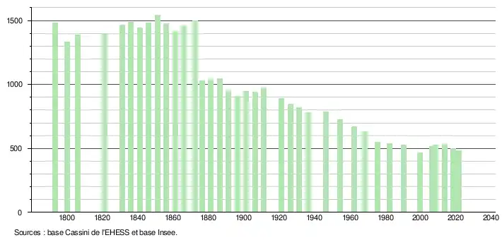 L'évolution du nombre d'habitants est connue à travers les recensements de la population effectués dans la commune depuis 1793. Pour les communes de moins de 10 000 habitants, une enquête de recensement portant sur toute la population est réalisée tous les cinq ans, les populations légales des années intermédiaires étant quant à elles estimées par interpolation ou extrapolation[21]. Pour la commune, le premier recensement exhaustif entrant dans le cadre du nouveau dispositif a été réalisé en 2008[22].