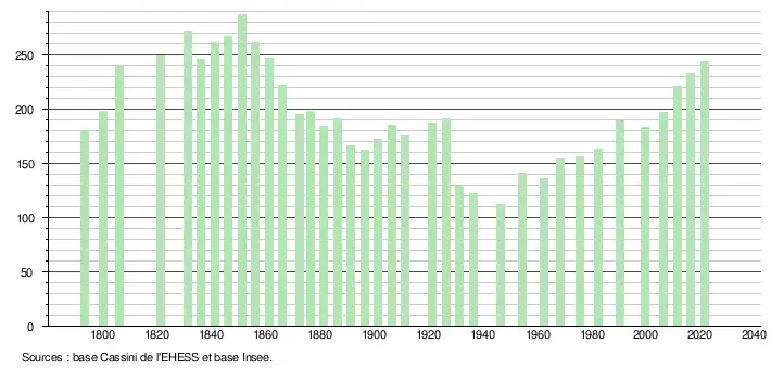 L'évolution du nombre d'habitants est connue à travers les recensements de la population effectués dans la commune depuis 1793. Pour les communes de moins de 10 000 habitants, une enquête de recensement portant sur toute la population est réalisée tous les cinq ans, les populations légales des années intermédiaires étant quant à elles estimées par interpolation ou extrapolation[18]. Pour la commune, le premier recensement exhaustif entrant dans le cadre du nouveau dispositif a été réalisé en 2006[19].