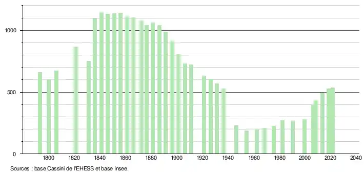 L'évolution du nombre d'habitants est connue à travers les recensements de la population effectués dans la commune depuis 1793. Pour les communes de moins de 10 000 habitants, une enquête de recensement portant sur toute la population est réalisée tous les cinq ans, les populations légales des années intermédiaires étant quant à elles estimées par interpolation ou extrapolation[31]. Pour la commune, le premier recensement exhaustif entrant dans le cadre du nouveau dispositif a été réalisé en 2008[32].