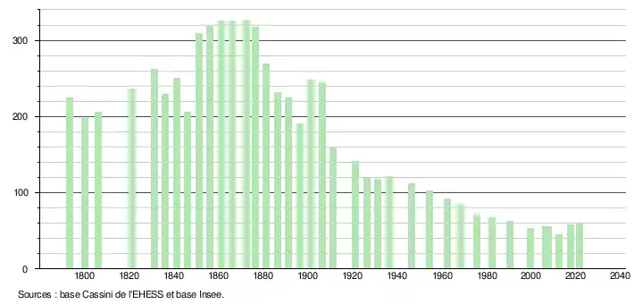 L'évolution du nombre d'habitants est connue à travers les recensements de la population effectués dans la commune depuis 1793. Pour les communes de moins de 10 000 habitants, une enquête de recensement portant sur toute la population est réalisée tous les cinq ans, les populations légales des années intermédiaires étant quant à elles estimées par interpolation ou extrapolation[30]. Pour la commune, le premier recensement exhaustif entrant dans le cadre du nouveau dispositif a été réalisé en 2007[31].