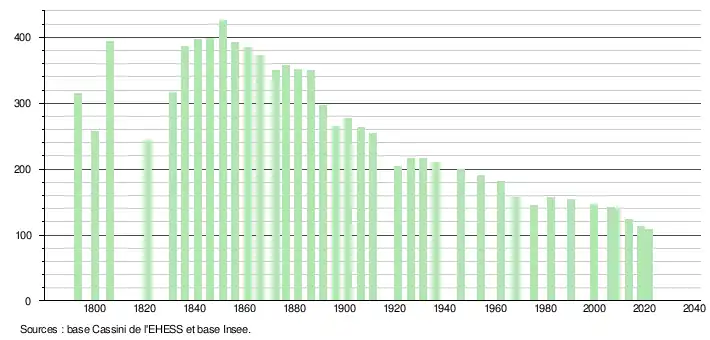L'évolution du nombre d'habitants est connue à travers les recensements de la population effectués dans la commune depuis 1793. Pour les communes de moins de 10 000 habitants, une enquête de recensement portant sur toute la population est réalisée tous les cinq ans, les populations légales des années intermédiaires étant quant à elles estimées par interpolation ou extrapolation[25]. Pour la commune, le premier recensement exhaustif entrant dans le cadre du nouveau dispositif a été réalisé en 2008[26].