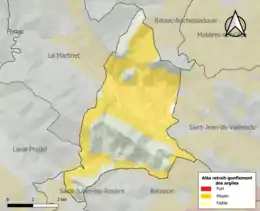 La commune est vulnérable au risque de mouvements de terrains constitué principalement du retrait-gonflement des sols argileux[20]. Cet aléa est susceptible d'engendrer des dommages importants aux bâtiments en cas d’alternance de périodes de sécheresse et de pluie. 62,2 % de la superficie communale est en aléa moyen ou fort (67,5 % au niveau départemental et 48,5 % au niveau national). Sur les 485 bâtiments dénombrés sur la commune en 2019, 469 sont en aléa moyen ou fort, soit 97 %, à comparer aux 90 % au niveau départemental et 54 % au niveau national. Une cartographie de l'exposition du territoire national au retrait gonflement des sols argileux est disponible sur le site du BRGM[21],[Carte 2].