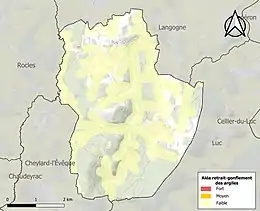 Le retrait-gonflement des sols argileux est susceptible d'engendrer des dommages importants aux bâtiments en cas d’alternance de périodes de sécheresse et de pluie. Aucune partie du territoire de la commune n'est en aléa moyen ou fort (15,8 % au niveau départemental et 48,5 % au niveau national). Sur les 118 bâtiments dénombrés sur la commune en 2019, aucun n'est en aléa moyen ou fort, à comparer aux 14 % au niveau départemental et 54 % au niveau national. Une cartographie de l'exposition du territoire national au retrait gonflement des sols argileux est disponible sur le site du BRGM[18],[Carte 2].