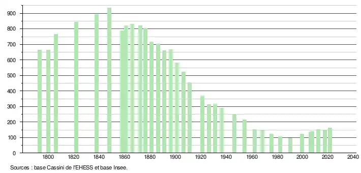 L'évolution du nombre d'habitants est connue à travers les recensements de la population effectués dans la commune depuis 1793. Pour les communes de moins de 10 000 habitants, une enquête de recensement portant sur toute la population est réalisée tous les cinq ans, les populations légales des années intermédiaires étant quant à elles estimées par interpolation ou extrapolation[10]. Pour la commune, le premier recensement exhaustif entrant dans le cadre du nouveau dispositif a été réalisé en 2007[11].